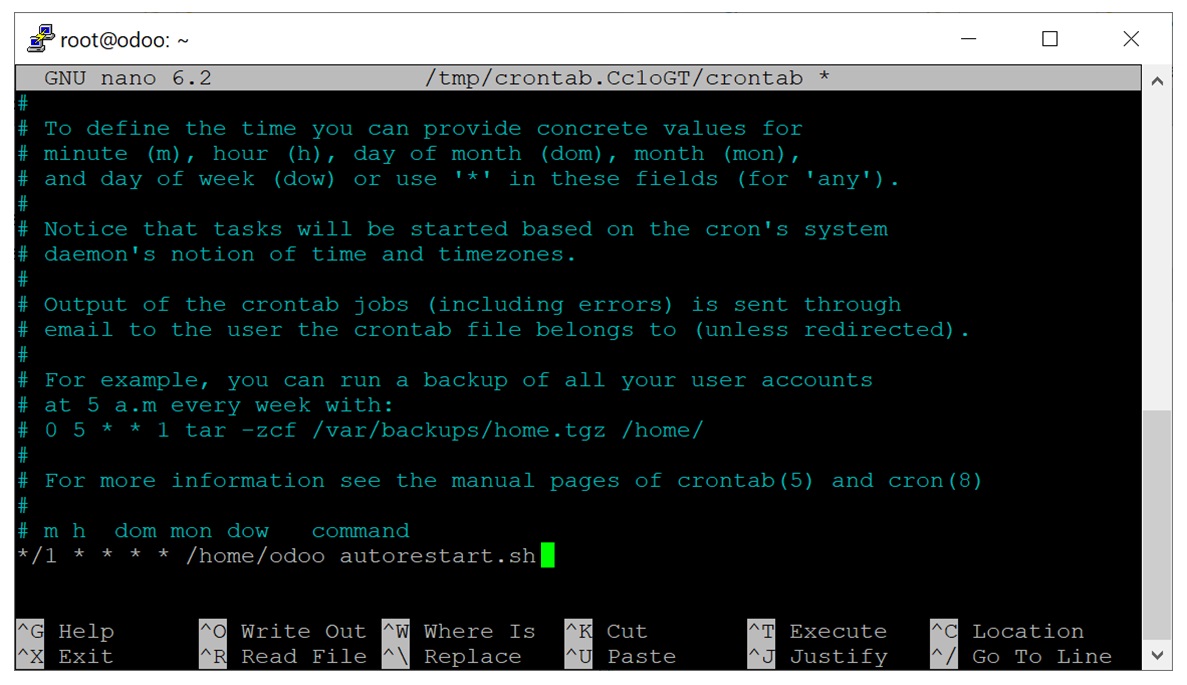 Gbr 2. Perintah cron job untuk menjalankan file odoo_autorestar.sh setiap satu menit