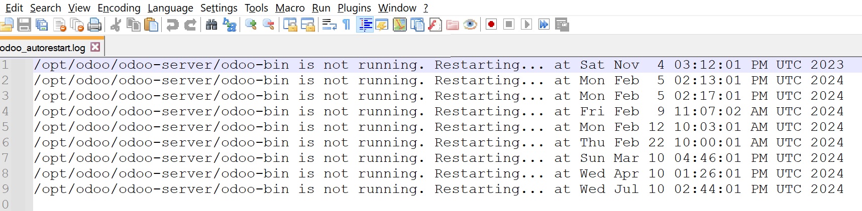 Untuk mengevaluasinya, pada folder ./home periksa isi file odoo_autorestart.log dan semestinya terdapat log terkait terjadinya restart, kira-kira seperti gambar berikut ini: