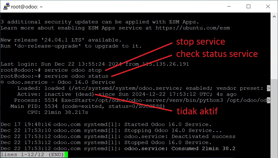Untuk mematikan service Odoo, ketik 2 perintah tersebut: