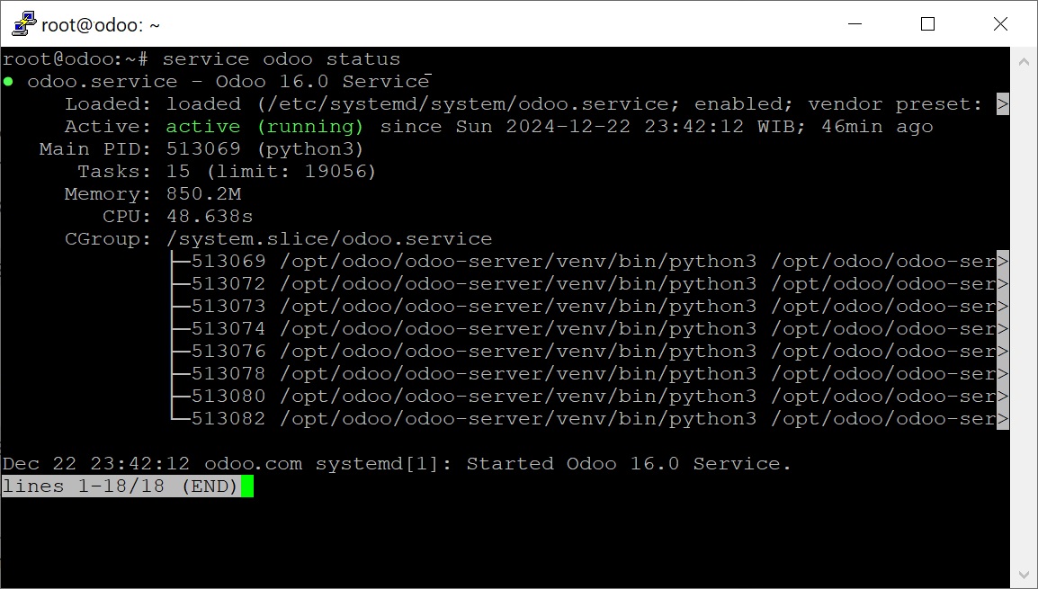 kemudian periksa kembali apakah service Odoo sudah up kembali.